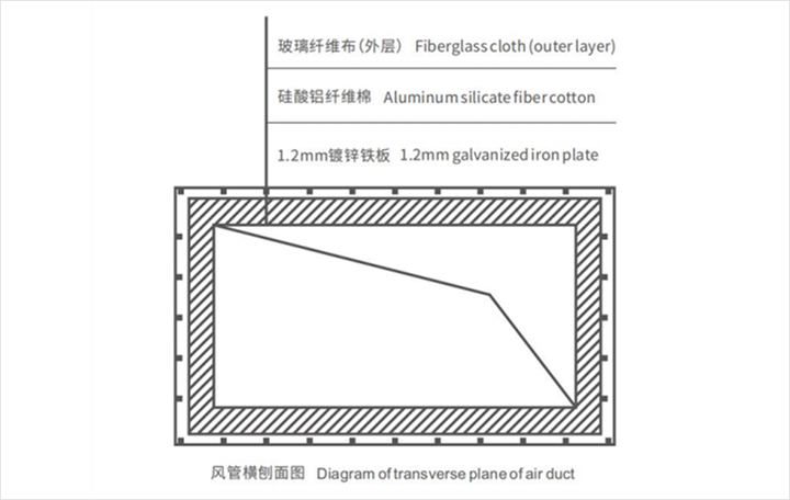 Estructura: Chapa de acero galvanizado + envoltura ignífuga flexible de silicato de aluminio. El algodón de fibra de silicato de aluminio se refuerza con una solución de silicato de sodio y se coloca algodón de fibra de silicato de aluminio entre las bridas. Instalación: Fijar la envoltura ignífuga flexible de silicato de aluminio a la placa de acero galvanizado con clavos para soldar.